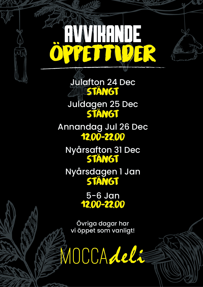 Välkommen till Mocca deli, här kan du unna dig något gott och en stund av avkoppling från vardagens stress. Kom och njut av en munsbit när helst du vill, oavsett om det är under en lunchpaus med kollegorna, en trevlig middag med släkten eller en avkopplande stund med din bästa kompis. Vi har skapat en mysig och trivsam miljö där du kan känna dig bekväm och ta fram livsnjutaren inom dig.